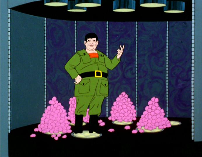 Well friends, he’s back. Episode five of the animated series, “More Troubles, More Tribbles” opens with the Enterprise taking two robotically controlled grain ships to a colony on Sherman’s Planet (who is Sherman anyway? And why does he get his own planet? Did they run out of generic science fiction sounding names?) which needs vast amounts of quadrotritcale to seed their fields so that they can produce grain and feed themselves. Suddenly, the ship veers off course to check out a Klingon battle cruiser not too far off. The Klingon battle cruiser is chasing a smaller ship of a common Federation design and Kirk wants to know why. Supposedly, the Klingons also have some kind of new weapon which, of course, bears investigating. When the Klingons start firing on the one man ship, Kirk demands that the captain of the battle cruiser identify himself. He also orders Scotty to lock onto the occupant of the smaller ship so they can pull his ass out of the fire. The Klingons, however, are slow to respond but they keep firing on the ship just the same and manage to blow it to smithereens just as Scotty plunks the lucky pilot onto the transporter pad. Unfortunately, however, it’s not good news. The occupant of the one man craft is none other than snake oil salesman non pareil Cyrano Jones. And oh goody GOODY! He’s got TRIBBLES in his pockets.