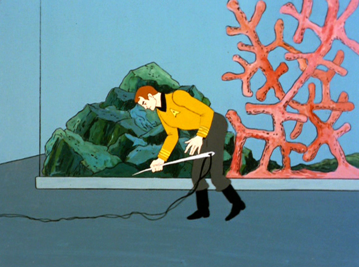 Apparently, the code-word being transmitted is “Terratin”. But what does it MEAN? The computer doesn’t know (and neither does Google. The closest it comes to is “terrain”). So Kirk feels compelled to go find out what the hell “Terratin” means. Is it a warning? An invitation? A dessert made with flaming brandy? Nobody knows… so let’s go poke at it with a stick… er… a phaser. Bones, always the voice of reason, asks if Kirk REALLY means to abandon the mapping mission for what’s probably going to turn into a wild goose chase.