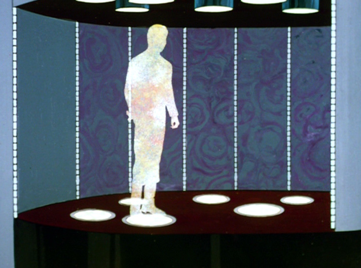 Kirk tells Sulu to aim phasers at the city and Spock, predictably, raises an eyebrow at this incredibly illogical behavior. He’s going to blow them the hell up, but why? Sulu fires on the city… and this has the odd response of causing it to be beamed up to the ship. It looks like a doll house sitting there on the transporter pad. Kirk peers through a device he calls a “macroscope”, only to see the mendant of the Terratins staring back at him. Hi!